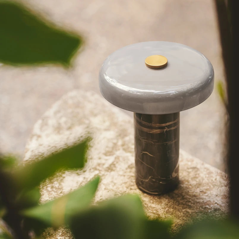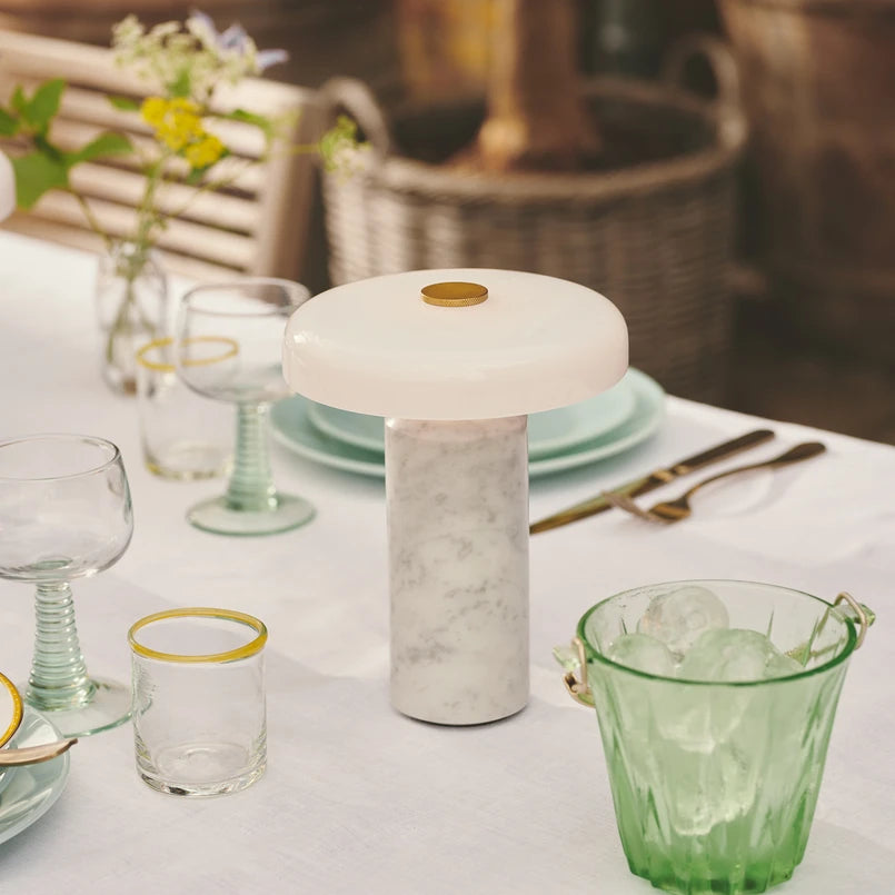 Featuring a solid marble base paired with a frosted glass shade, the lamp softly diffuses light downward, creating a calm and intimate glow. The sculptural form and carefully finished surfaces give the lamp a timeless, tactile quality that complements cottage, Nordic, and modern interiors alike.